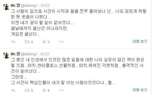 또한 강병규는 15일 “그 사람의 입으로 사건의 시작과 끝을 전부 들어보니 난 헛웃음이 나왔다. 내가 이젠 굳이 할 일이 없어졌다. 게임은 끝났다” 등의 의미심장한 글을 게재했다.