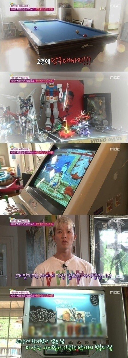 이날 공개된 팝핀현준·박애리 부부의 집에는 음료 자판기를 비롯해 학교 앞 문구점에서 볼 수 있는 오락기, 당구대까지 설치돼 있다.