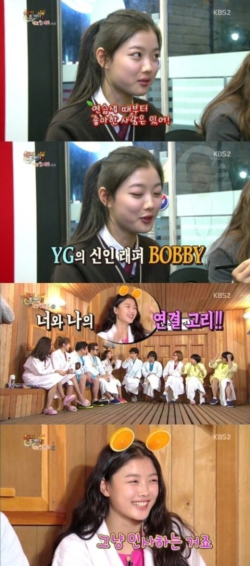 지난 4일 방송된 KBS2 ‘해피투게더3’에서 김유정은 “연습생 때부터 좋아한 사람은 있다. 바비”라고 고백했다. 이어 “만나본 적은 없다”며 “연습생 때부터 좋아했다. 웃는 게 예쁘다”고 설명했다.