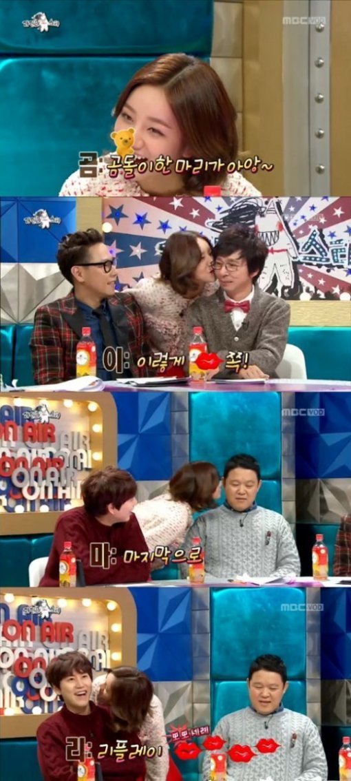 이어 그는 “곰. 곰돌이 한 마리가 돌. 돌아다니다가 이. 이렇게 쪽”이라며 김국진의 뺨에 뽀뽀하는 시늉을 했다. MC 윤종신과 김구라의 자리로 간 혜리는 “한. 한 번 더 쪽 마. 마지막으로 쪽”이라며 차례로 뽀뽀하는 시늉을 했다.