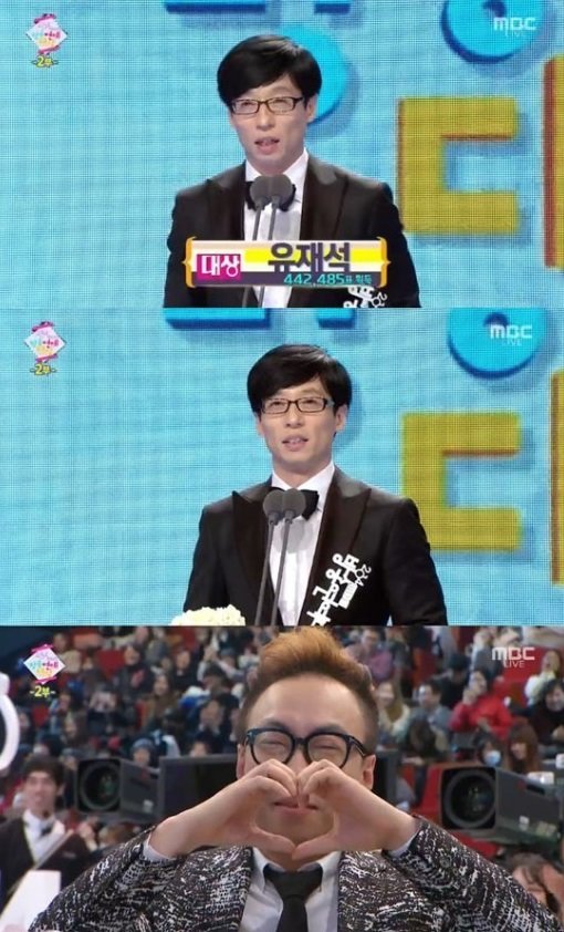 이날 유재석은 문자투표에 참가한 약 67만 명 중 약 44만 명의 선택을 받아 대상을 수상했다.