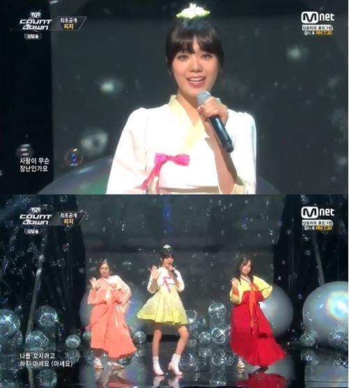 리지는 이날 무대에 상큼한 개량한복을 입고 등장했다. 또한 특유의 매력적인 목소리와 깜찍한 안무로 리지만의 매력을 발산했다.