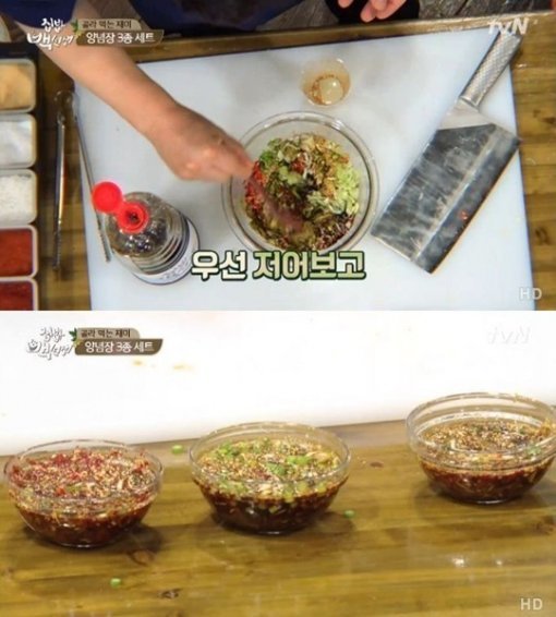 이어 설탕을 소주잔으로 반 컵, 깨소금 반 컵을 놓은 후 진간장 종이컵 한 컵 반, 간 마늘 한 숟갈, 참기름을 뿌렸다. 백종원은 완성된 기본 양념장을 세 그릇에 나눈 후, 각각 고춧가루, 마늘종을 넣은 양념장 3종 세트를 완성했다.