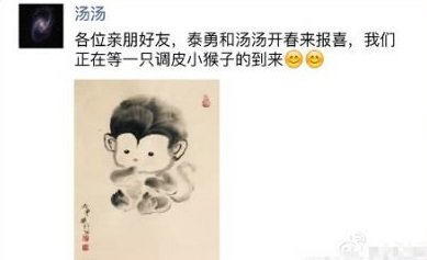 공개된 이미지는 탕웨이와의 메신저 내용을 캡처한 것이다. 메신저에는 “태용 탕탕이 봄을 맞이해 좋은 소식을 알립니다. 저희가 작은 원숭이를 기다리고 있어요”라고 쓰여있다.