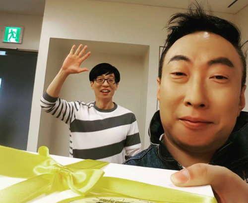 선물을 들고 있는 박명수의 뒤로 유재석도 보인다.