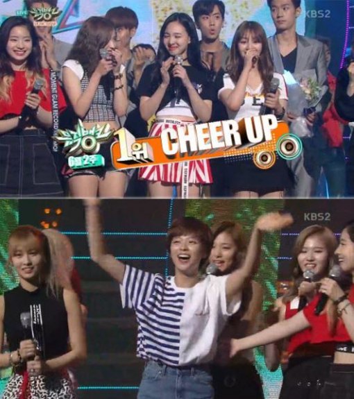 10일 방송된 KBS 2TV ‘뮤직뱅크’에서 트와이스 ‘CHEER UP’은 5,734표를 획득해 5,407표를 얻은 어반자카파의 ‘널 사랑하지 않아’를 누르고 1위를 차지했다.