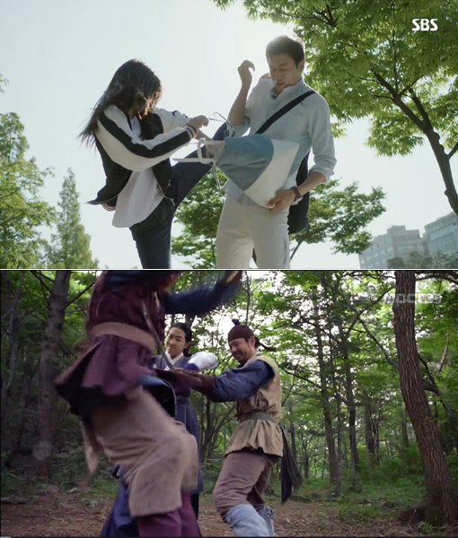 SBS ‘닥터스’(위쪽사진)와 MBC ‘옥중화’는 동시간대 시청률 1위를 지키는 인기 드라마다. 그 여주인공인 박신혜와 진세연의 액션신이 여성 시청자의 시선을 모으고 있다. 사진출처|SBS·MBC 방송화면 캡처.