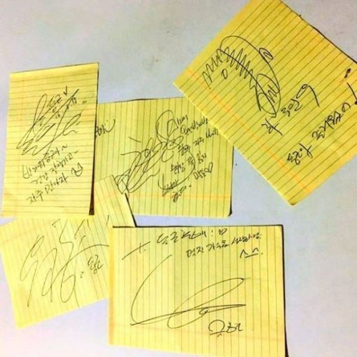 사진 속에는 이날 라디오스타에 함께 출연한 테이, 효린, 하현우, 윤종신, 규현의 사인이 담겨있다. 노란색 줄 노트에 담긴 ‘반가워 건강 잘 챙기고 자주 만나자’(테이), ‘순수함 쭉 잃지 말길(효린)’ ‘동근아 즐거웠어(하현우)’ 등 한동근을 향한 응원 멘트가 눈길을 모은다.