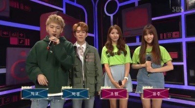 그룹 블락비의 멤버 지코와 박경, 그룹 여자친구의 멤버 유주, 소원 네 사람이 ‘인기가요’에서 호흡을 맞췄다.