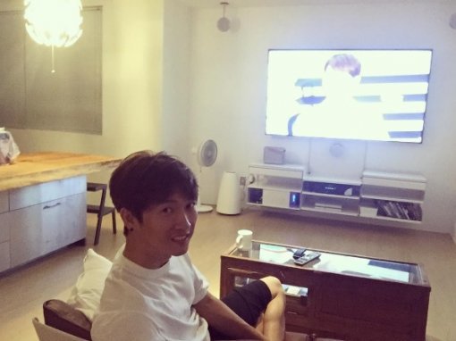 사진 속 장우혁은 자신의 집 거실 소파에 앉아 카메라를 보며 미소를 짓고 있다.