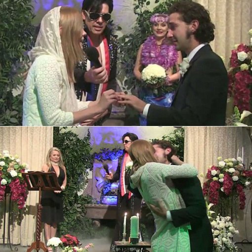 새 신부 미아 고스는 긴팔 크로셰 화이트 드레스를, 새 신랑 샤이아 라보프는 검은색 정장을 차려입었다. 엘비스 프레슬리 음악에 맞춰 예배당에 입장한 두 사람은 행복한 분위기 속에 예식을 올렸다.