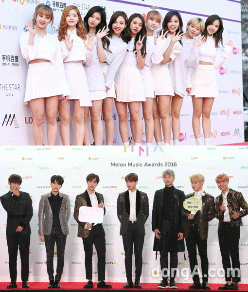 걸그룹 트와이스와 남성 아이돌그룹 방탄소년단이 각각 2016년 음원과 앨범 차트 정상에 올랐다.