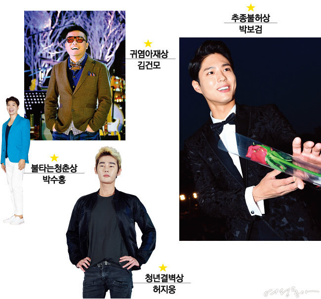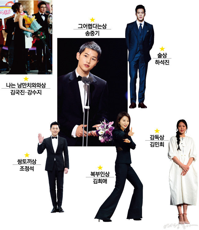 그어렵다는상 송중기 드라마 〈태양의 후예〉로 대박을 치면서 송중기 신드롬을 낳았다. 한중 합작으로 제작된 이 드라마는 중국에서도 열풍을 일으키며 그가 입은 군복과 선글라스 등이 품절됐고, 연예인으로선 이례적으로 KBS 〈뉴스 9〉에 특별 게스트로 초대되기도 했다. 그 어렵다는 ‘여심올킬’을 송중기가 해냈지 말입니다. 나는 낭만치와와상 김국진·강수지 수많은 아이돌 커플들을 제친 연예계 베스트 커플은 김국진과 강수지다. 예능 프로그램 〈불타는 청춘〉에 함께 출연하다 작년 가을 무렵부터 연인으로 발전한 두 사람은 지난 8월 1년째 열애 중이라는 사실이 알려졌다. 뒤늦게 맺어진 ‘치와와 커플’의 인연이 하루빨리 결실을 맺기를 바라본다.