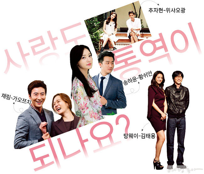 사랑한다면 이들처럼, 탕웨이-김태용 ‘대륙의 여신’ 탕웨이(38)와 김태용(48) 감독의 결혼 생활은 한국과 중국 연예계의 뜨거운 관심사. 2009년 영화 〈만추〉 촬영 당시 여배우와 감독으로 처음 만난 두 사람은 이후 친구로 지내다가 2013년 탕웨이가 광고 촬영차 내한했을 때 연인으로 발전했다. 김태용 감독은 탕웨이 사진을 붙여놓고 〈만추〉 시나리오 작업을 했고, 탕웨이는 김 감독이 투영된 〈만추〉의 남자 주인공 훈(현빈)이 이상형이라고 말한 바 있을 만큼 운명적인 커플이다. 2014년 스웨덴과 홍콩에서 웨딩마치를 울린 두 사람은 현재 베이징과 제주도, 홍콩을 오가며 생활하고 있다. 지난 8월에는 건강한 딸을 품에 안았다. 김태용 감독이 메가폰을 잡은 단편 영화 〈그녀의 전설〉 OST에 탕웨이가 참여하고, 탕웨이가 주연을 맡은 영화 〈북 오브 러브〉의 뮤직비디오를 김태용 감독이 연출하는 등 부부이자 동료로 계속 함께 호흡을 맞추고 있다. 낭만 커플, 채림-가오쯔치 지난 2003년 초기 한류 열풍을 타고 중국에 진출해 〈애상여주파〉 〈신취타금지〉 등에 출연하며 큰 인기를 모은 채림(38)은 2014년 중국 배우 가오쯔치(36)와 결혼하며 ‘대륙의 아내’가 됐다. 182cm의 큰 키에 탄탄한 몸매, 선한 인상으로 대륙 여심을 사로잡은 가오쯔치는 드라마 회당 출연료가 1억2천만원에 달하는 톱스타. 두 사람은 2012년 CCTV 드라마 〈이씨가문〉에 부부로 출연한 후 사랑을 키웠다. 특히 가오쯔치는 결혼을 앞두고 베이징의 번화가에서 가수 신승훈의 ‘I Believe’를 한국어로 부르며 무릎을 꿇고 로맨틱한 프러포즈를 해 화제가 됐다. 그는 결혼 후 “한국 음식과 드라마, 노래를 더 좋아하게 됐다”고 말하며 아내 사랑을 과시했다. 현재 두 사람은 드라마 〈좌수온난우수〉에 동반 캐스팅돼 촬영 중이다. 애정 전선 이상무, 송승헌-류이페이