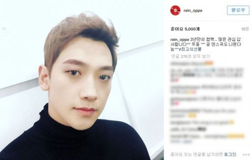 비는 15일 인스타그램에 “3년 만의 컴백. 많은 관심 감사합니다. 두둥. 곧 댄스곡도 나온다는. 최고의 선물”이라는 글과 함께 자신의 셀카를 올렸다.