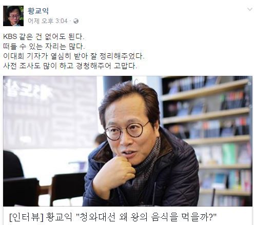 황교익은 이날 자신의 페이스북에 “KBS 같은 건 없어도 된다. 떠들 수 있는 자리는 많다”며 프레시안과 인터뷰한 내용을 소개했다.