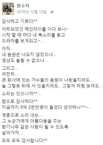 드라마 ‘도깨비’ OST 풀버전 음원이 가수 표기 문제로 25일 논란에 휩싸인 가운데, 원곡 가수 한수지가 과거 소셜미디어 남겼던 의미심장한 글이 주목받고 있다.