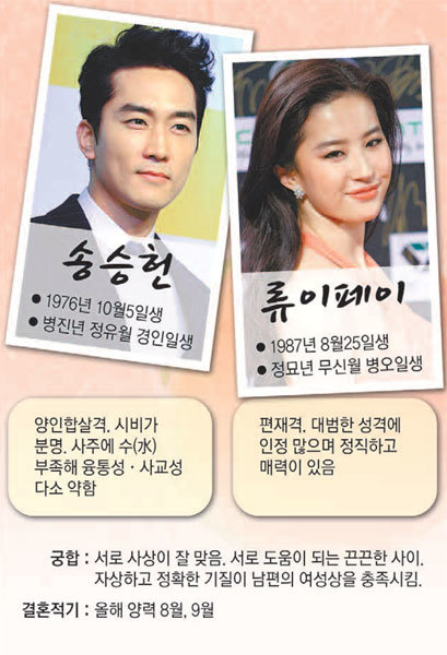송승헌의 양인합살격, 류이페이의 편재격이 상생해 잘 맞는다. 12신살로 보면 송승헌과 류이페이는 각각 반안살(명예·직위에 있어 높은 곳에 오를 액운)과 육해살(나와 가족들에 해를 끼칠 액운)의 관계로, 인연의 측면에서나 현실적인 삶에 있어서 서로 도움이 되는 끈끈한 사이다.