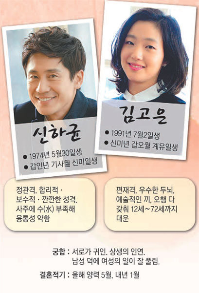 구성(九星)으로 봐도 상생하는 관계다. 12신살로 보면 신하균과 김고은은 망신살(집안의 재물을 없애고 몸을 망칠 액운)과 반안살의 관계로, 서로의 부족한 부분을 보필해줄 수 있는 좋은 인연이다. 정관격 사주의 남성은 애교 있는 여성을 필요로 하는데, 보수적인 남성의 사주가 싹싹한 여성의 사주를 만나니 금상첨화다. 결혼 시기는 5월과 내년 1월이 좋다.