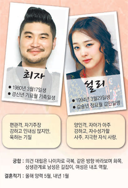 스포츠동아가 설 명절을 맞아 박경호 역술가의 도움을 얻어 스타 커플들의 궁합을 봤다. 아울러 이들이 결혼식을 올리기 적절한 시기도 들었다. 화제의 커플인 신하균·김고은, 최자·설리의 궁합도 살펴본다. 단, 사주(四柱)로 사람의 운수를 풀이할 뿐이니, 맞으면 좋고 아니라도 이들의 사랑은 여전히 아름답다. 인생·사회관 비슷해 의견 대립 없어 부족한 부분 서로 채워주고 잘 맞아