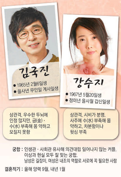 김국진·강수지 모두 상관격 사주인 까닭에 인생관이나 사회관이 유사해 의견 대립이 일어나지 않는 커플이다. 오행의 측면에서는 서로 부족한 부분을 채워주고, 이상적·현실적인 면 모두 잘 맞는 궁합이다. 구성(九星, 색깔과 오행을 조합해 만든 9가지 경우의 수로 보는 점술)으로 보아도 두 사람은 상생관계이다. 12신살(神殺, 12가지 액운)로 보면 남자는 역마살(늘 분주히 떠돌아다닐 액운), 여자는 월살(독수공방의 액운)의 관계라 김국진은 길잡이, 강수지는 내조의 역할로 서로에게 꼭 필요한 사람이다. 박경호 역술가가 꼽는 두 사람의 결혼 적기는 양력 9월이나 내년 1월이다.