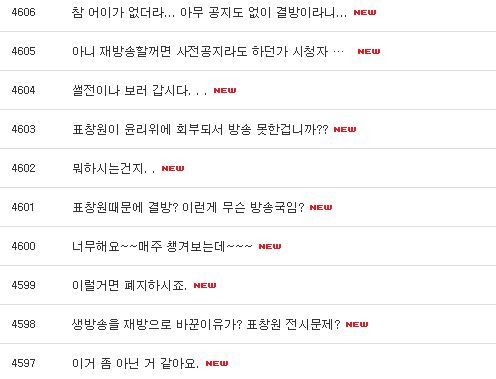 TV조선 시사대담 프로그램 ‘강적들’이 아무런 공지 없이 돌연 결방해 ‘왜 사전 공지를 하지 않았나? 결방 이유가 뭐냐?’는 항의와 비난글이 시청자 게시판에 쏟아지고 있다.