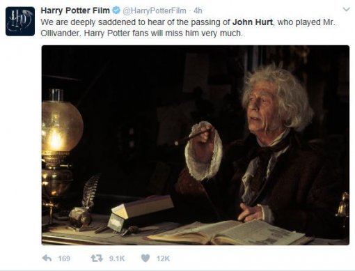 해리포터 필름은 28일(한국시각) 영화 ‘해리포터’에서 올리밴더 역으로 출연했던 배우 존 허트의 사망 소식에 “깊은 슬픔에 빠졌다”면서 “해리포터 팬들은 그를 잊지 못할 것”이라고 밝혔다.