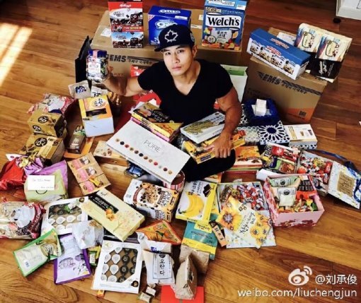 선물은 대부분 한글이 써있는 한국산 과자와 초콜릿이다. 그의 설명에 따르면, 이는 발렌타인데이를 맞아 한국팬들에게 받은 선물이다.