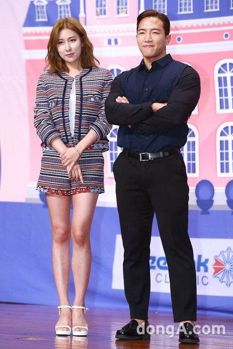 가수 스테파니(왼쪽), 스포츠트레이너 윤태식이 12일 오전 서울 영등포구 63컨벤션센터에서 열린 케이블채널 Mnet ‘아이돌학교’ 제작발표회에 참석해 포토타임을 하고 있다.