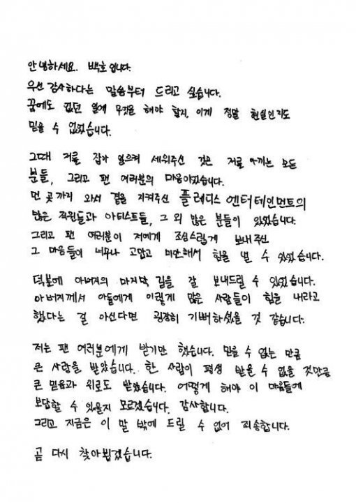 그는 “우선 감사하다는 말씀부터 드리고 싶다”며 “팬 여러분이 저에게 조심스럽게 보내주신 그 마음이 너무나 고맙고 미안해서 힘을 낼 수 있었다. 덕분에 아버지의 마지막 길을 잘 보내드릴 수 있었다”고 말했다.