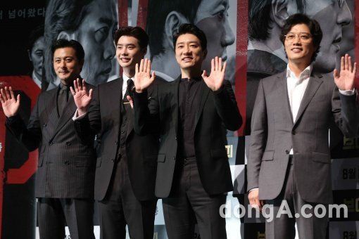 배우 장동건, 김명민, 박휘순, 이종석(왼쪽부터)이 31일 오전 서울 강남구 한 멀티플렉스관에서 열린 영화 \'브이아이피\' 제작보고회에서 포토타임을 하고 있다.