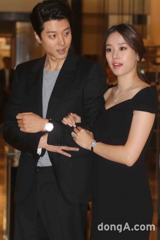 배우 이동건과 조윤희 부부가 11일 오후 서울 강남구 신세계백화점에서 열린 주얼린 브랜드 다이아니 오픈식에 참석하고 있다.