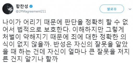 찬성은 이어 "나이가 어리기 때문에 판단을 정확히 할 수 없어서 법적으로 보호한다. 이해하지만 그렇게 처벌이 약해지기 때문에 죄에 대한 정확한 의식이 없지 않을까. 반성은 자신의 잘못을 알았을 때 하는 건데 자신이 얼마나 큰 잘못을 저지른 건지 알기나 할까"라고 적었다.