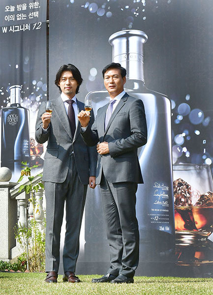24일 주한 영국 대사관에서 진행된 출시 행사에서 디아지오코리아 조길수 대표(오른쪽)와 신제품 모델인 배우 현빈이 ‘더블유 시그니처 12’를 소개하고 있다. 사진제공|디아지오코리아