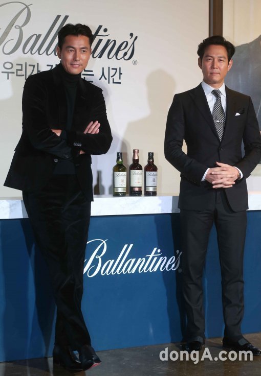 배우 정우성(왼쪽)과 이정재가 26일 오후 서울 시립미술관에서 열린 위스키 발렌타인 \'우리가 깊어지는 시간\' 캠페인 론칭에서 포토타임을 하고 있다.