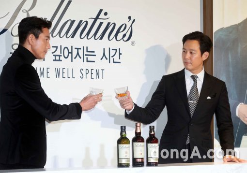 배우 정우성(왼쪽)과 이정재가 26일 오후 서울 시립미술관에서 열린 위스키 발렌타인 \'우리가 깊어지는 시간\' 캠페인 론칭에서 포토타임을 하고 있다.