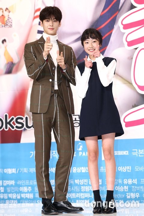 배우 차은우(왼쪽), 김환희가 26일 오전 서울 영등포구 타임스퀘어에서 옥수수TV 드라마 ‘복수노트’ 제작발표회에 참석해 포토타임을 하고 있다.