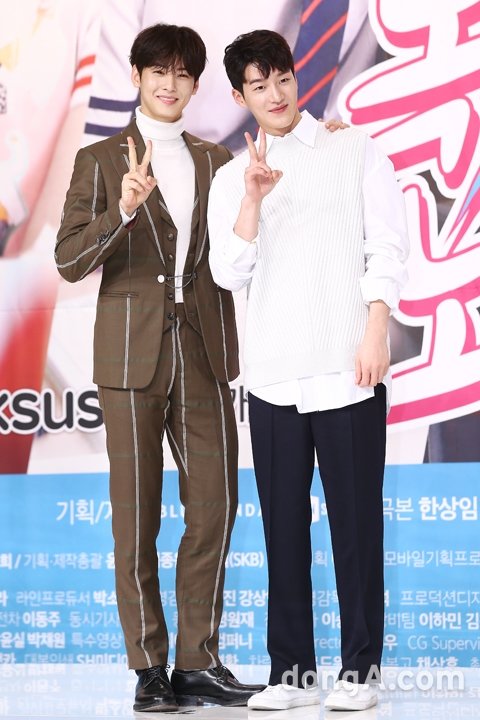 배우 차은우(왼쪽), 지건우가 26일 오전 서울 영등포구 타임스퀘어에서 옥수수TV 드라마 ‘복수노트’ 제작발표회에 참석해 포토타임을 하고 있다.