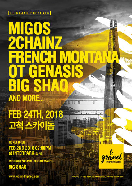 참여 아티스트로는 ‘비틀스의 재림’이라고까지 칭송되는 힙합역사상 최강의 트리오 미고스, 트랩씬의 선구자이며 레전드 그 자체로 평가받는 투 체인즈, 켄드릭 라마와 함께 오마바 전 대통령이 가장 좋아하는 아티스트인 프렌치 몬태나, 한국에서도 유명한 싱글 ‘코코’의 주인공 오티 제나시스, 그리고 작년말 구글트렌드 1위를 기록하며 국내 중·고생사이에서 폭발적인 인기를 누린 빅샥까지 2018년 가장 핫한 힙합 슈퍼스타 5명을 한자리에서 만나볼 수 있는 공연이다.