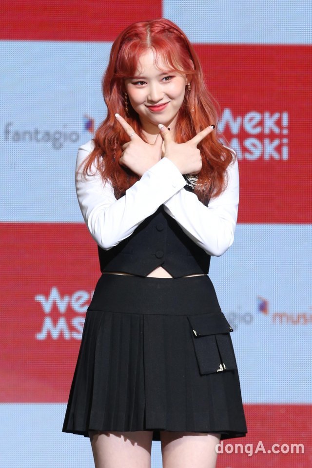 그룹 위키미키의 엘리가 21일 오후 서울 광진구 예스24 라이브홀에서 열린 두번 째 미니앨범 럭키 컴백 쇼케이스에서 포토타임을 하고 있다.