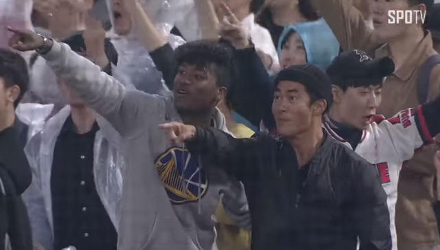 이대호가 홈런을 치자 관중석에 앉아있던 롯데 팬들은 환호했고, 이 가운데 배정남과 한현민의 모습도 중계 카메라에 잡혔다.