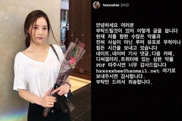 한서희는 16일 인스타그램 스토리에 “안녕하세요 여러분, 부탁드릴 것이 있어서 이렇게 글을 쓴다”며 “현재 저를 향한 수많은 악플과 전혀 사실이 아닌 루머 유포로 무척이나 힘든 시간을 보내고 있다. 네이트, 네이버 기사 댓글, 다음 카페, 디씨갤러리, 트위터에 있는 심한 악플 PDF 따주시면 감사드린다. hxxsxxhee@hanmail.net로 보내주면 감사하다. 부탁만 드려서 죄송하다”고 남겼다.