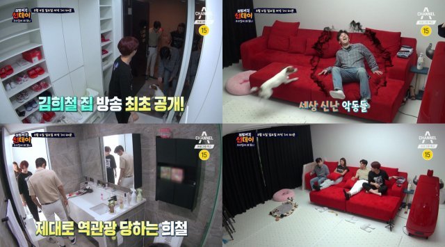 악동 MC 한혜진,오스틴강, 딘딘은 김희철의 집을 방문하자마자 집안 구석구석을 살펴보며 김희철의 혼을 빼놓아 현장을 웃음바다로 만든다.