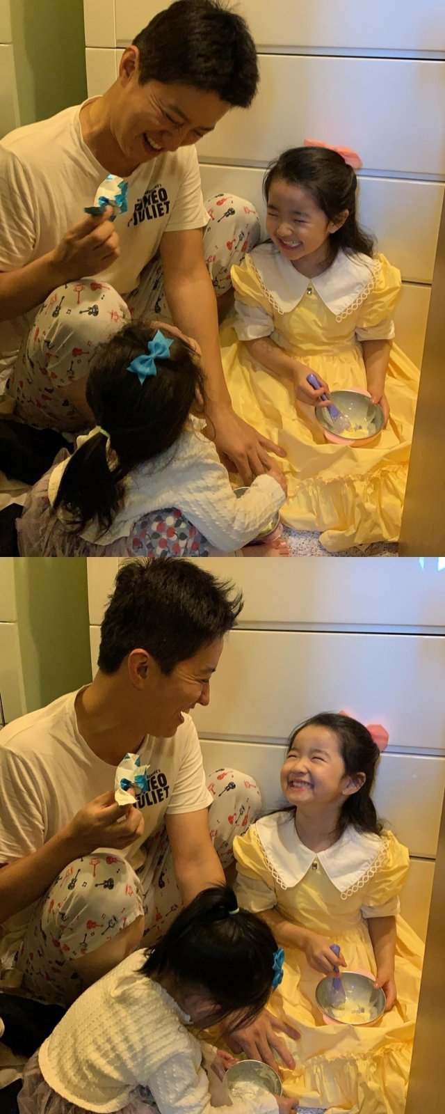 사진 속에는 딸 하은이와 소은이가 아이스크림을 먹고 있는 모습을 행복한 미소를 지으며 바라보고 있는 인교진의 모습이 담겨있다. 아빠의 얼굴을 바라보며 웃음을 짓는 하은이의 미소가 훈훈함을 자아낸다.
