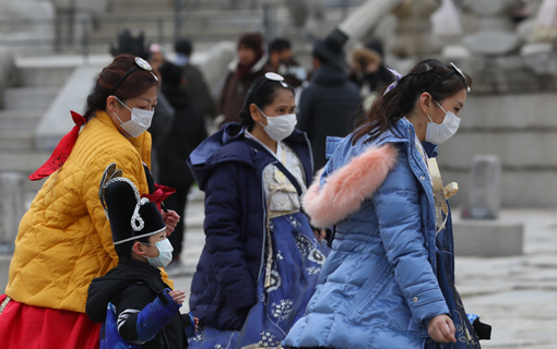 신형 코로나 바이러스 네번째 확진자가 발생한 27일 오후 서울 경복궁에서 한복을 입은 한 관광객들이 마스크를 쓰고 있다. 송은석 기자 silverstone@donga.com