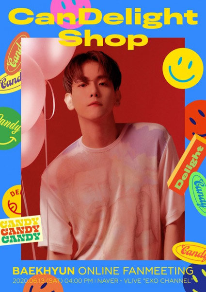 그룹 엑소의 멤버 백현이 13일 온라인 팬미팅을 연다. 소속사 SM엔터테인먼트는 8일 “백현이 지난달 25일 두 번째 솔로 음반 ‘딜라이트’를 발매한 기념으로 13일 오후 4시 네이버 V라이브를 통해 온라인 팬미팅 ‘캔딜라이트 샵’을 진행할 예정‘이라고 밝혔다. 백현은 팬미팅에서 직접 근황을 밝히고 팬들로부터 미리 받은 질문에 대해 답변할 예정이다. 백현은 타이틀곡 ‘캔디’로 7일 SBS ‘인기가요’를 비롯한 각종 음악방송에서 1위를 차지했다.