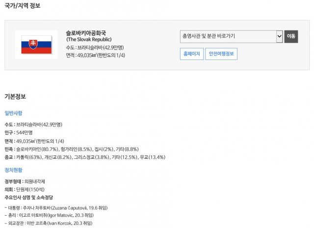 외교부에 따르면 슬로바키아는 인구 544만 명의 국가로, 수도는 브라티슬라바다. 면적은 4만9035㎢로, 한반도의 1/4 수준이다. 민족은 슬로바키아인(80.7%), 헝가리인(8.5%), 집시(2%) 등으로 구성돼 있다.