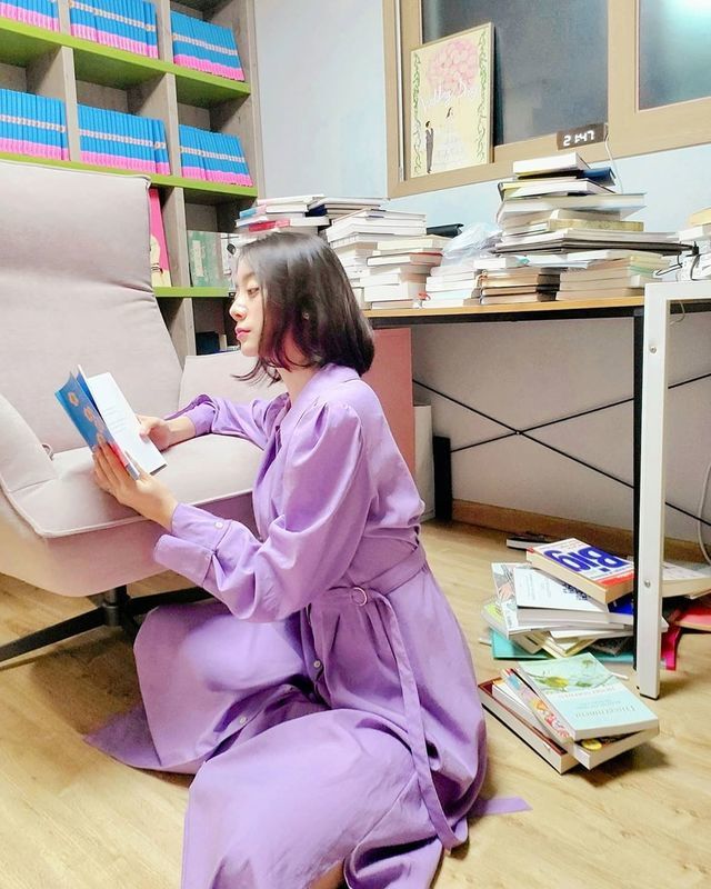 이와 함께 첨부한 사진에는 책에 집중하고 있는 우혜림의 모습이 보인다. 바닥과 책상 위에 여러 권의 쌓여있고, 선반에도 수십 권의 책이 꽂혀 있다.