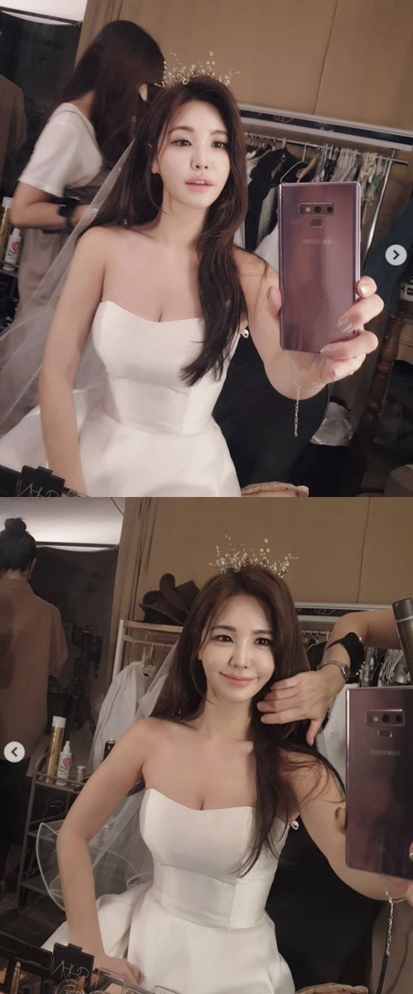 공개된 사진에는 웨딩 촬영에 앞서 웨딩드레스를 입고 거울 셀카를 찍는 강예빈의 모습이 담겼다. 웨딩드레스를 입은 채 섹시한 매력을 드러내고 있어 눈길을 끈다.