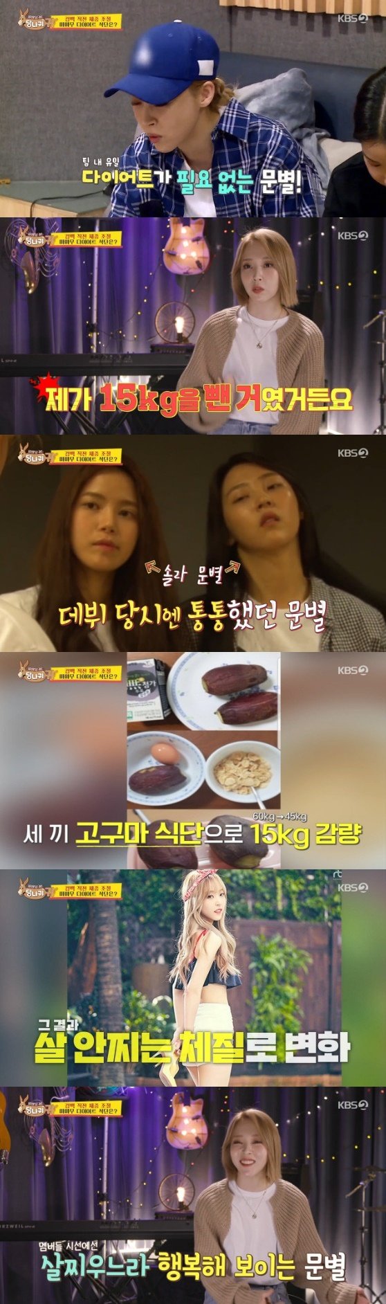 그러나 문별은 10첩 반상을 제대로 챙겨 먹어 눈길을 끌었다. 문별은 “데뷔 당시엔 통통했다”며 “그러다 고구마 다이어트로 15kg을 뺐는데 이후에 살이 안 찌는 체질로 변했다”라고 말했다.